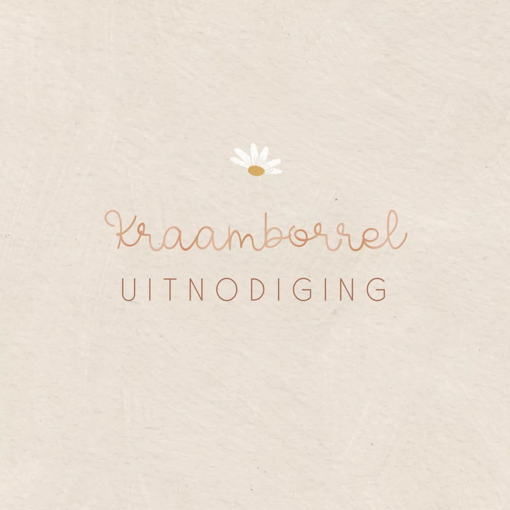 Nodig jouw vrienden en familie uit voor de kraamborrel van jouw kindje. Het kaartje heeft een beige structuur achtergrond met daarop hoogglans letters en een madeliefje.