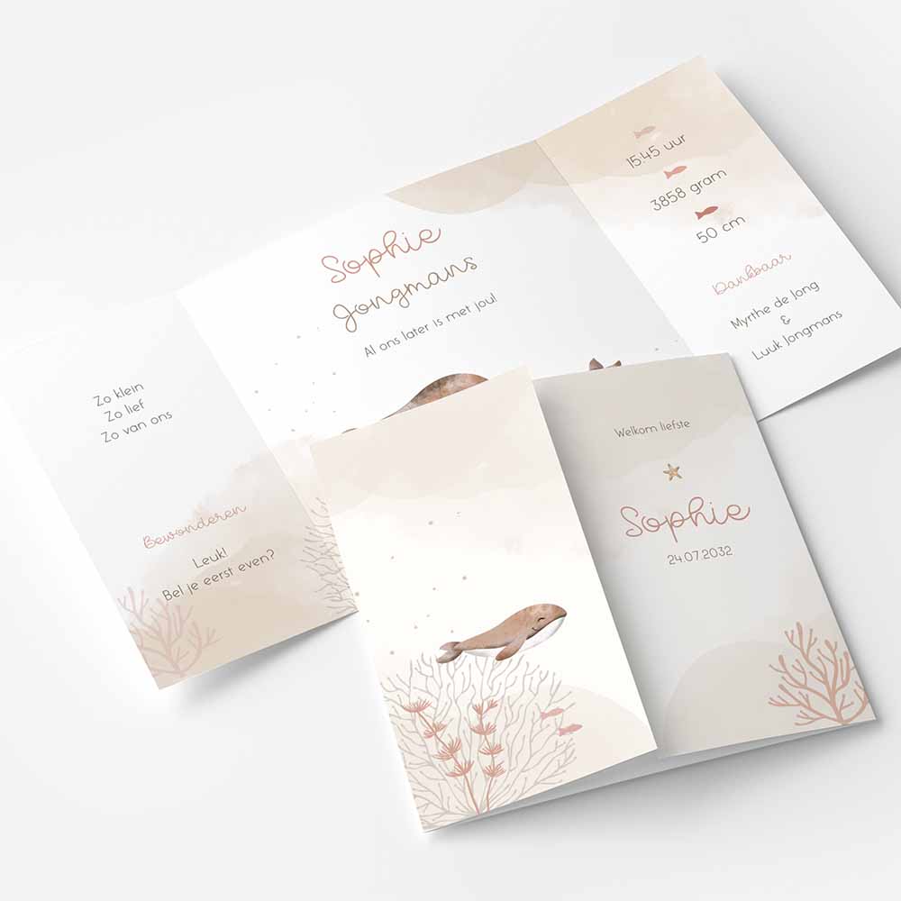 Schattig geboortekaartje in theatervorm en beige waterverf. Het kaartje heeft een schattige illustratie van walvisgezin. Pas het ontwerp naar wens aan in onze online editor.