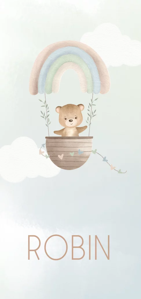 Een vrolijk geboortekaartje voor jouw kindje. Het kaartje heeft verschillende zachte pastelkleuren. Op het kaartje zie je een beertje in een regenboog luchtballon. Onderaan lees je de naam van het kindje, Pas het kaartje naar wens aan in onze editor.