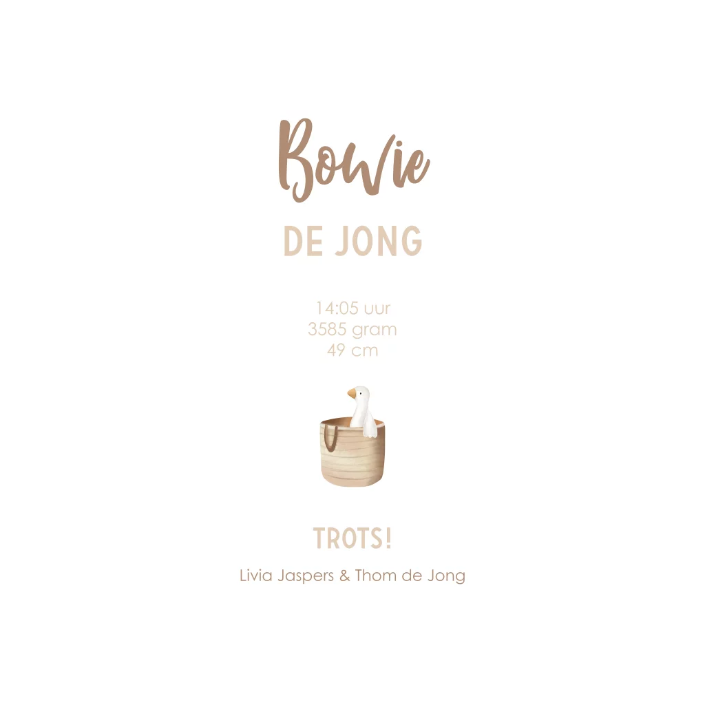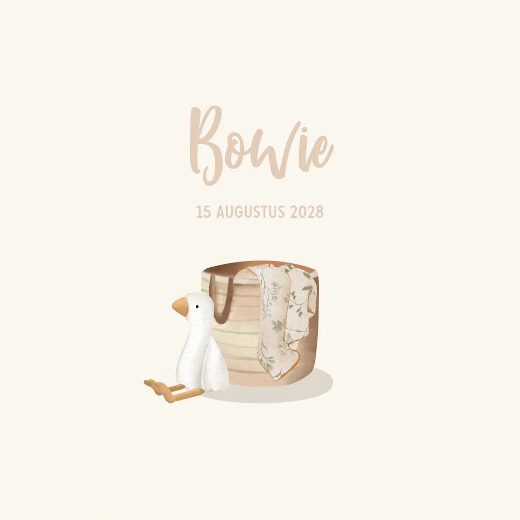 Een lief geboortekaartje voor jouw kleine. Het kaartje heeft een créme achtergrond met daarop een lieve illustratie van een gansje zittend tegen een mandje. Pas het kaartje naar wens aan in onze online editor.