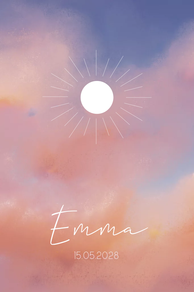 Dit is een prachtig kaartje voor jullie pasgeboren dochter. Op het kaartje is een kleurrijke lucht te zien met een goudfolie zon. Ook de naam wordt gedrukt in goudfolie, waardoor dit kaartje een luxe uitstraling krijgt. Pas het kaartje naar wens aan in onze online editor. Bestel een proefdruk en bewerk dit kaartje in het echt.
