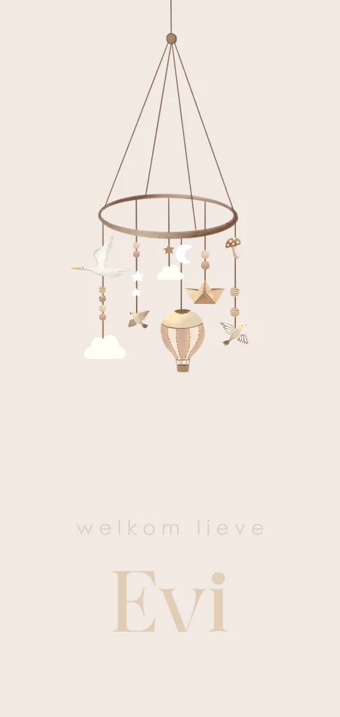 Een stijlvol geboortekaartje voor jouw kindje. Het kaartje heeft een beige achtergrond met daarop een hangende mobiel met verschillende elementjes en goudfolie details. Pas het ontwerp naar wens aan in onze online editor.