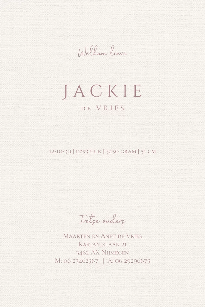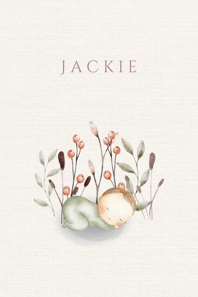 Wat een lief geboortekaartje. Op dit beige kaartje ligt een slapende baby tussen de veldbloemen. Pas het ontwerp naar wens aan in onze online editor.