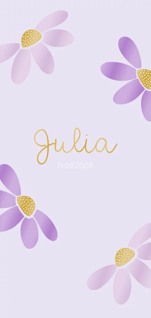 Kondig de geboorte van je dochter aan met dit mooie kaartje. Het kaartje heeft een lila achtergrond met bloemen in hoogglans. De hoogglans geeft dit kaartje een luxe uitstraling. Pas het kaartje naar wens aan in onze online editor en bestel een proefdruk om dit kaartje in het echt te zien!