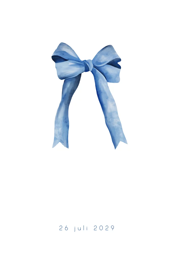 Kondig de geboorte van je dochter aan met dit klassieke kaartje. Het kaartje heeft een witte achtergrond met de watercolour illustratie van een blauwe strik. De goudfolie details geven dit kaartje een luxe uitstraling. Het kaartje is naar wens aan te passen in onze online editor.