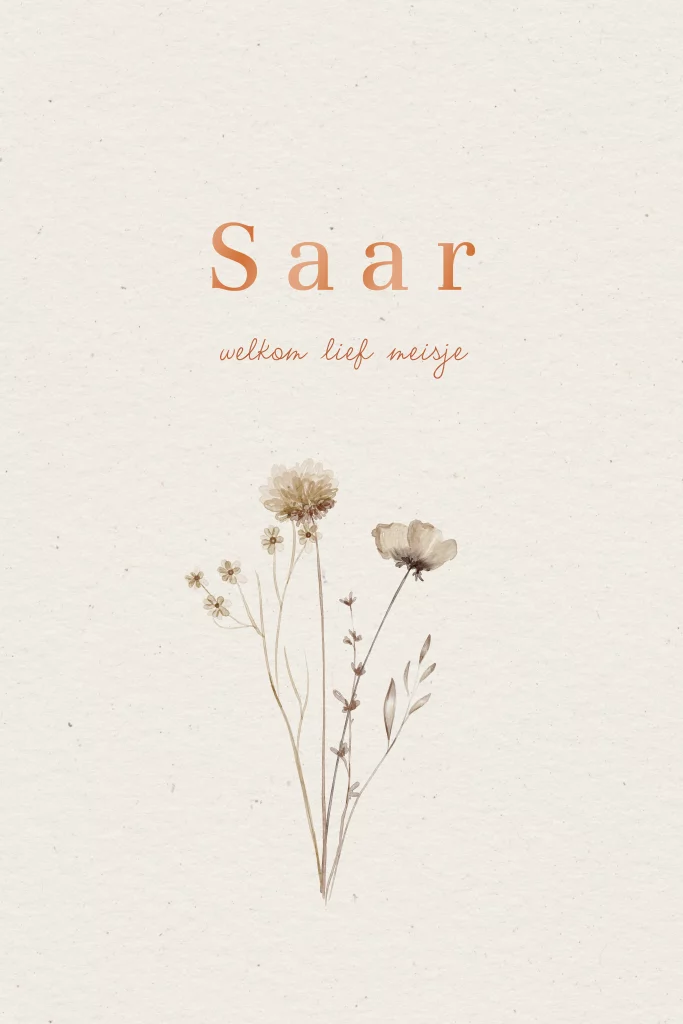 Dit is een lief geboortekaartje voor jullie dochter. Het kaartje heeft een lichte achtergrond met de prachtige illustratie van droogbloemen. De hoogglans naam maakt dit kaartje helemaal compleet. Het kaartje is naar wens aan te passen in onze online editor. Bestel een proefdruk en bewonder dit kaartje in het echt!