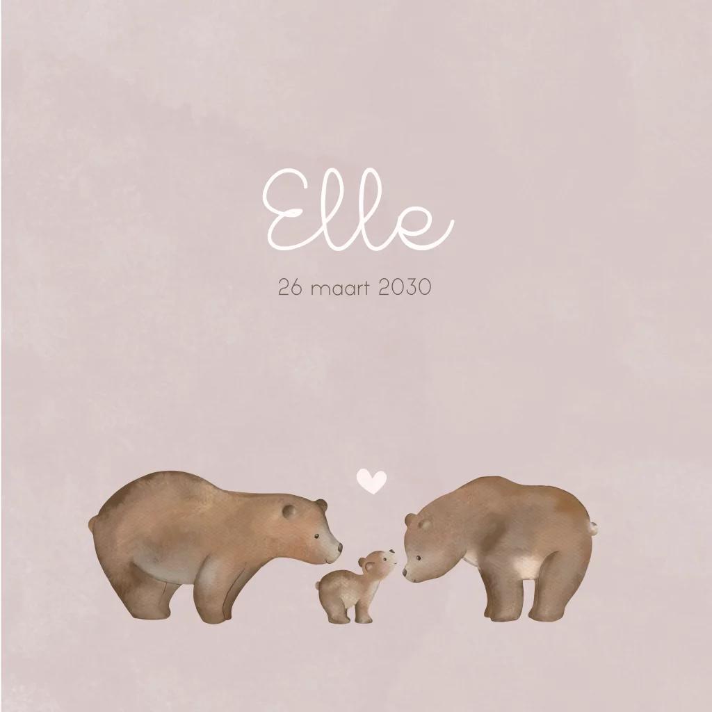 Roze geboortekaartje met watercolour, berenfamilie en hartje