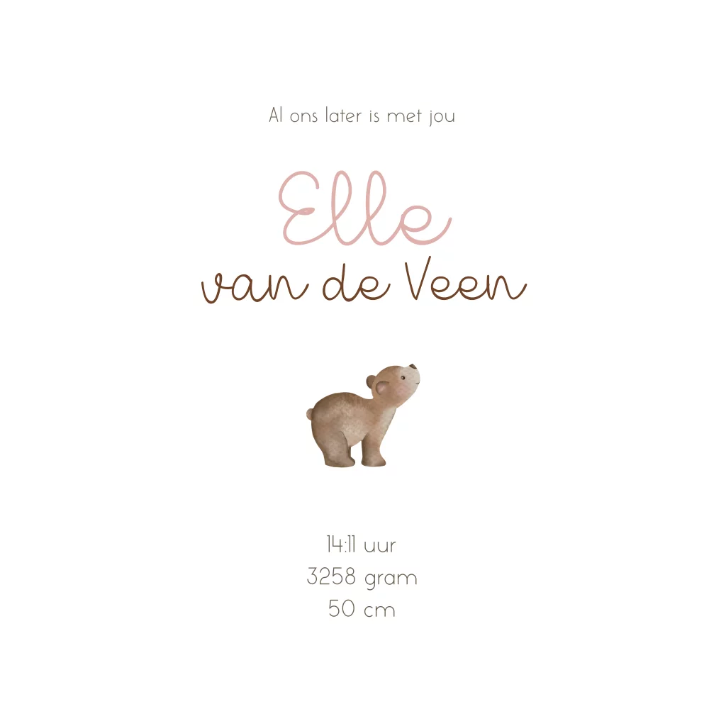 Dit is een lief kaartje voor je pasgeboren dochter. Het kaartje heeft een roze watercolour achtergrond met de illustratie van een berenfamilie. Ook zo'n fan van dit kaartje? Bestel een proefdruk en bewonder dit kaartje in het echt.