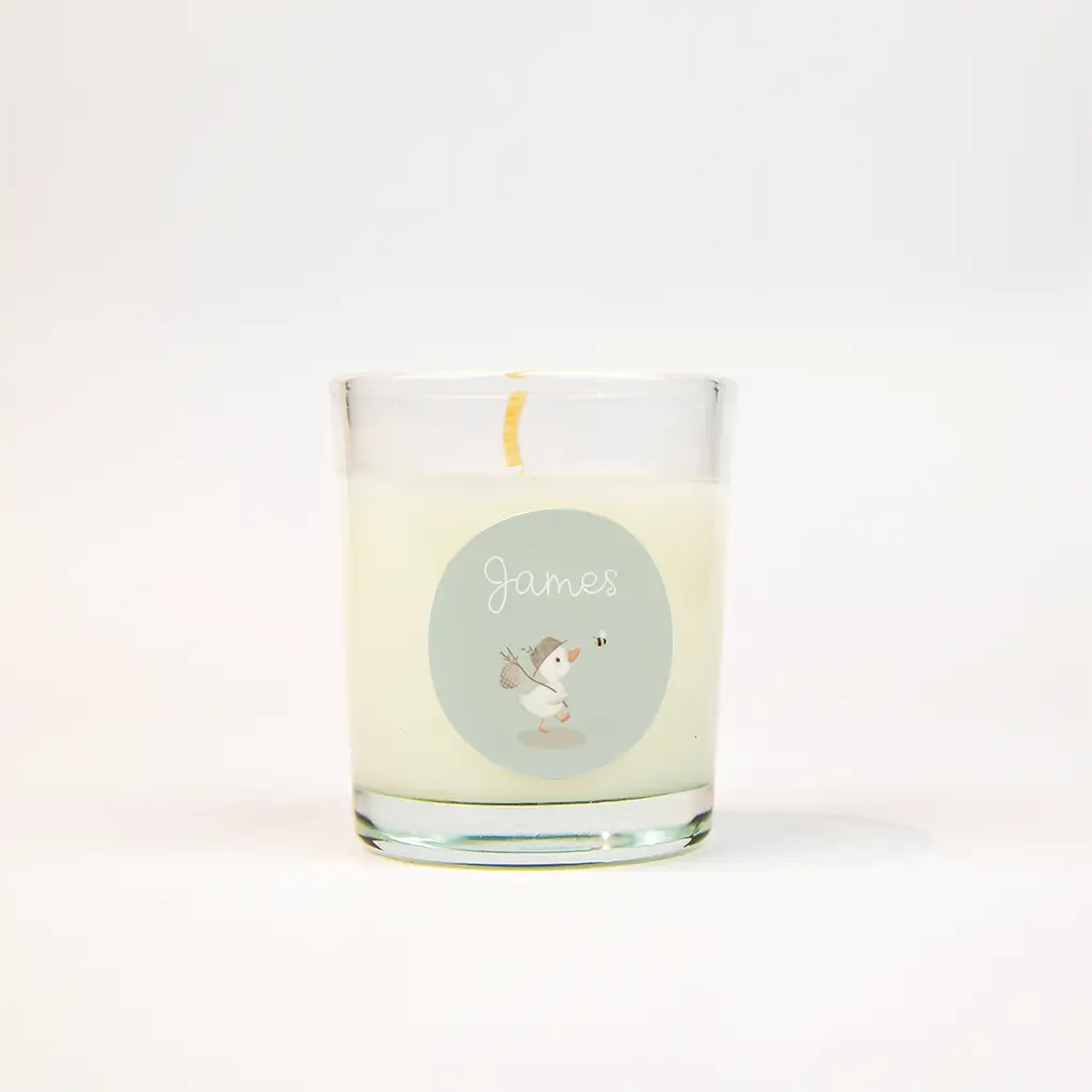 Doopsuiker naamsticker in de stijl van het geboortekaartje. De sticker heeft een groene achtergrond met daarop de naam en een lief eendje. Pas het ontwerp naar wens zelf aan.
