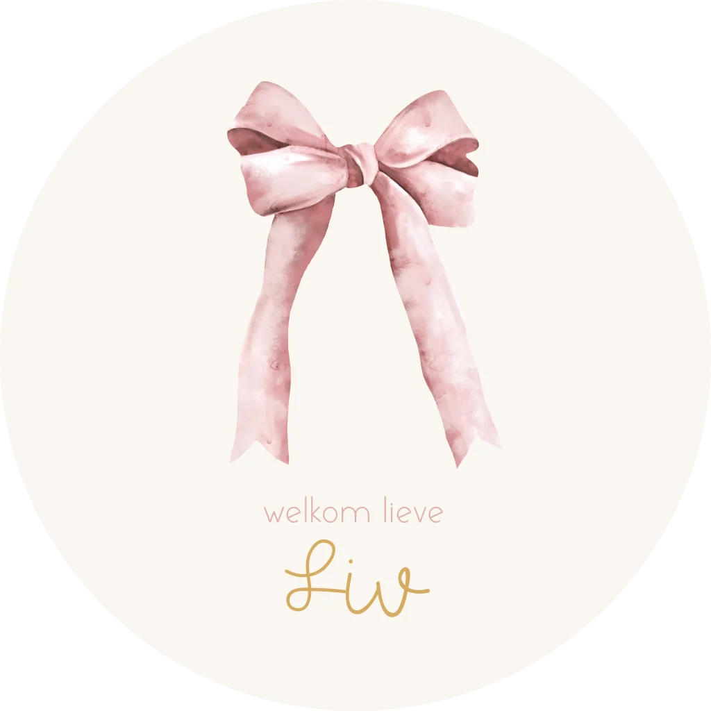 Kondig de geboorte van jullie kindje aan met deze ronde raamsticker. De sticker heeft een lichte achtergrond met een illustratie van een roze strik. De sticker is naar wens aan te passen in onze online opmaaktool. Tip: zonder geboortedatum kun je de sticker al voor de geboorte in huis halen!