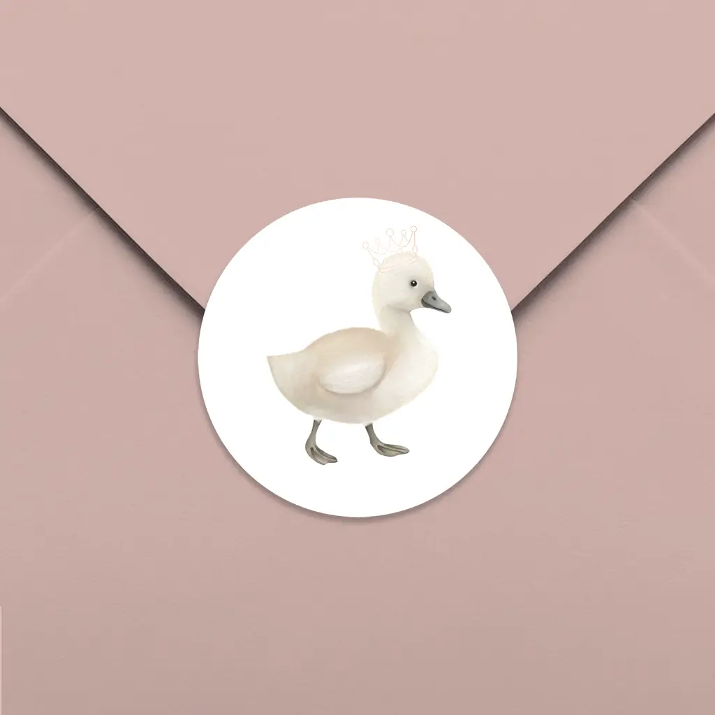 Een lieve sluitsticker met een illustratie van een zwaan die een kroon draagt. De kroon wordt gedrukt in roségoudfolie voor een luxe uitstraling. Pas de sticker eenvoudig aan naar wens in onze online editor. Bekijk hier het bijpassende geboortekaartje.
