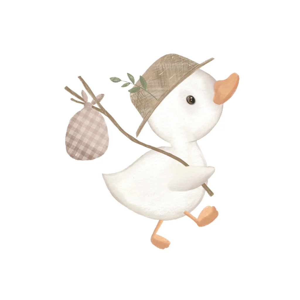 Een schattige sluitsticker met een lief eendje en knapzak, perfect om het versturen van je geboortekaartje extra persoonlijk te maken.