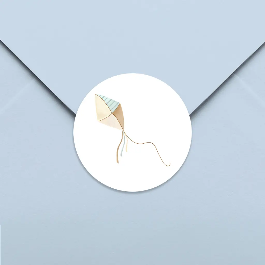 Vrolijke sluitsticker met de illustratie van een vlieger in blauw en beige! Met dit ontwerp kan jij volledig je creativiteit laten gaan en een eigen sluitsticker maken.