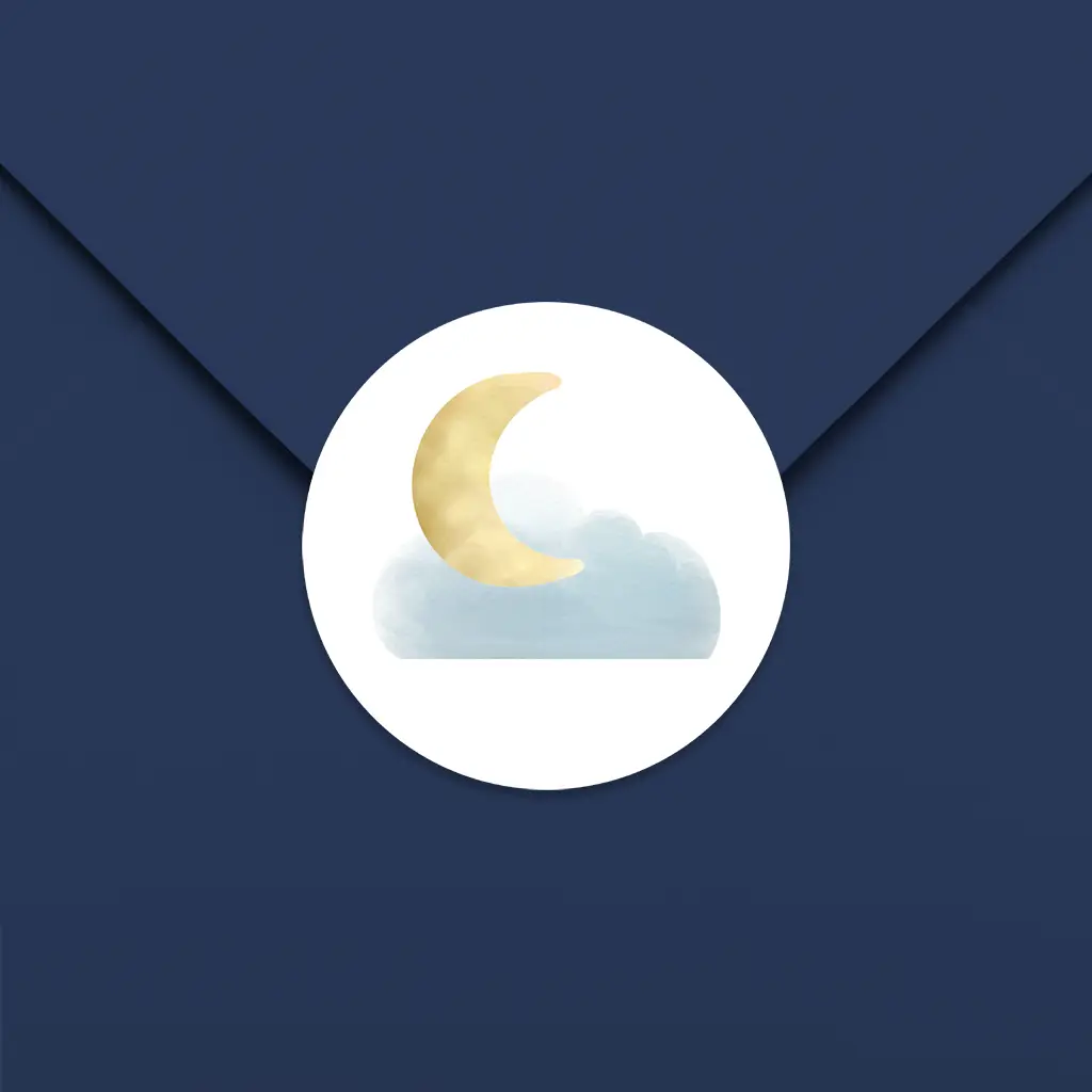 Schattige sluitzegel met maan en wolk in aquarel. Personaliseer de sluitsticker in onze online editor. Bekijk hier het bijpassende geboortekaartje.