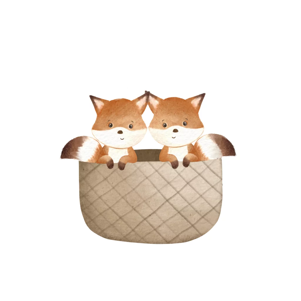 Een schattige sluitsticker voor bij het geboortekaartje. De sticker heeft een vrolijke illustratie van twee vosjes in een mandje. De sticker is te personaliseren in onze online editor.