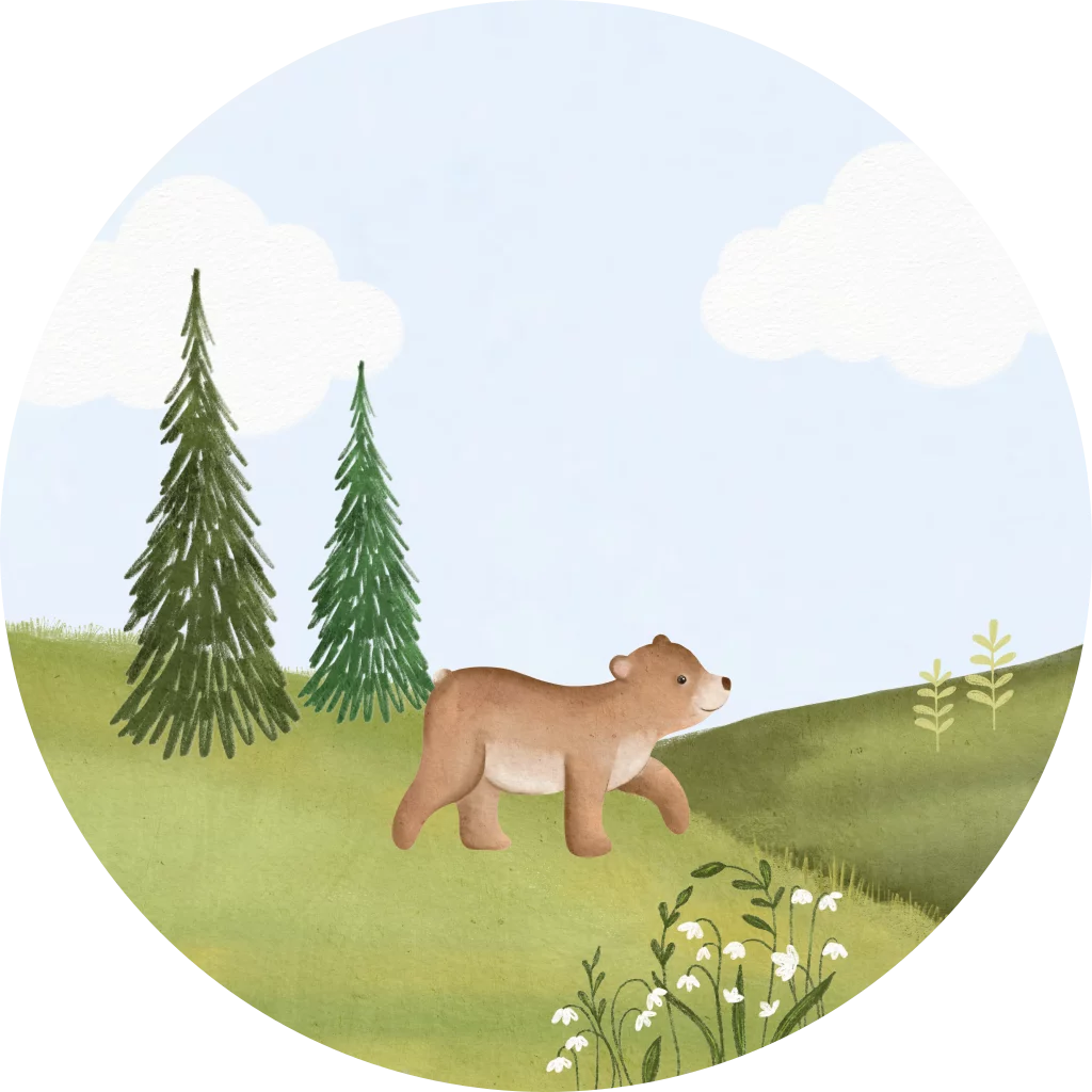 Een vrolijke en schattige sluitsticker in de stijl van het geboortekaartje. Het stickertje heeft prachtige illustraties van een beertje in de natuur. Pas het ontwerp naar wens zelf aan.
