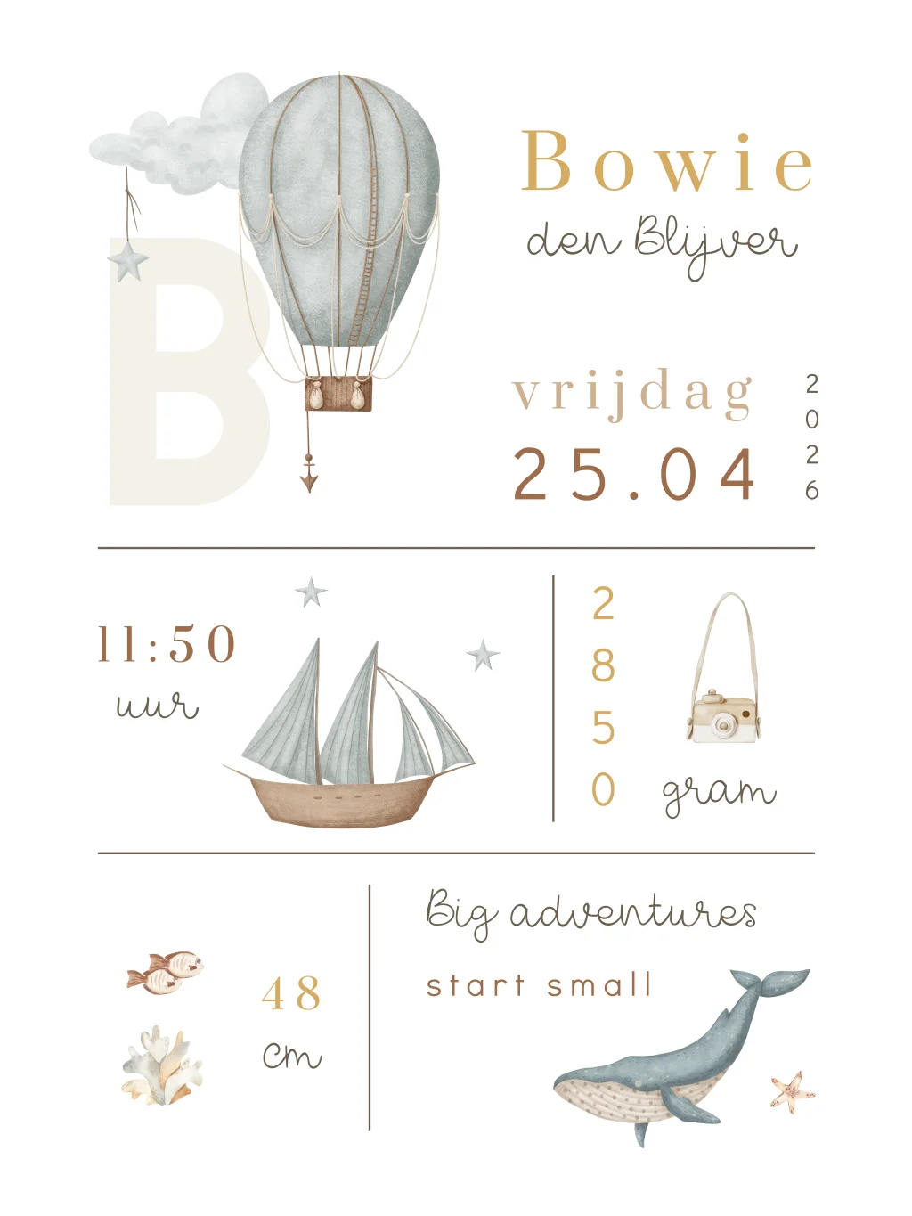 Een schattige babykamer poster met blauwe illustraties. Daarnaast kan je alle geboortegegevens op unieke wijze noteren. Pas de poster naar wens aan in onze online editor.