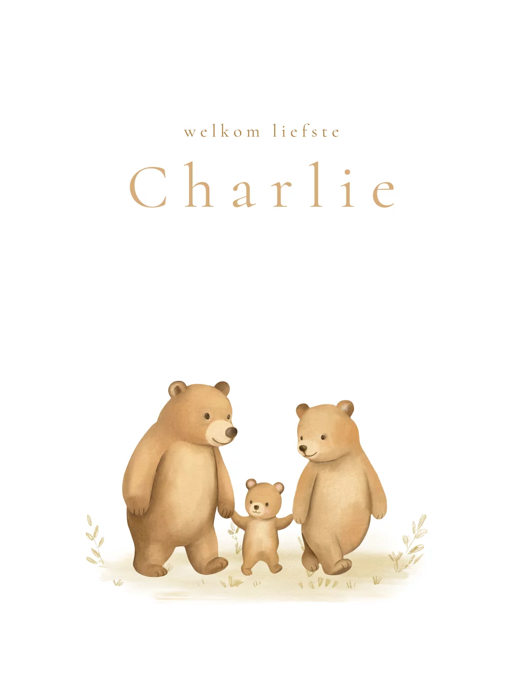 Een lieve poster bijpassend bij het geboortekaartje. De poster heeft een lieve illustratie van een berenfamilie in het gras. Pas het ontwerp naar wens zelf aan.