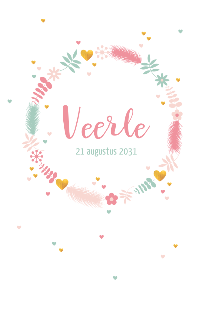 Aanpasbare poster voor de kinderkamer van een meisje met een krans met botanische blaadjes, bloemetjes en goudlook hartjes.