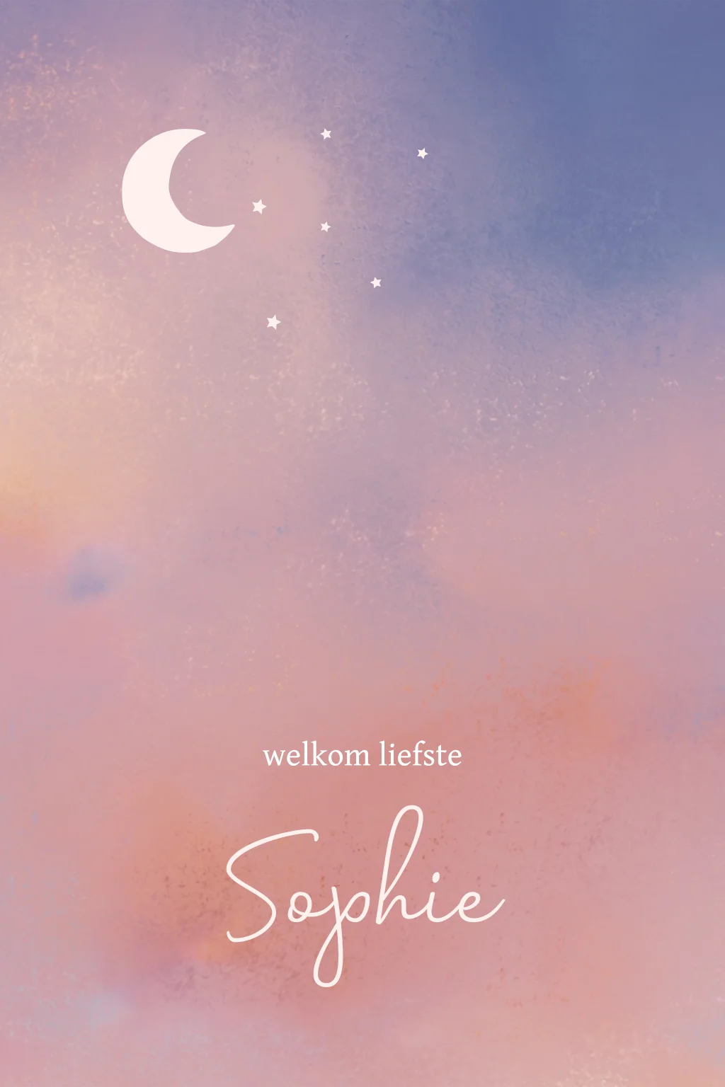 Een stijlvolle poster voor op de kinderkamer. De poster heeft een dromerige wolken achtergrond in pastelkleuren. Pas het ontwerp naar wens zelf aan.