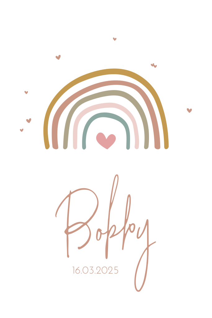 Trendy babykamer poster met een hippe regenboog met hartje en trendkleuren zoals okergeel en oudroze.