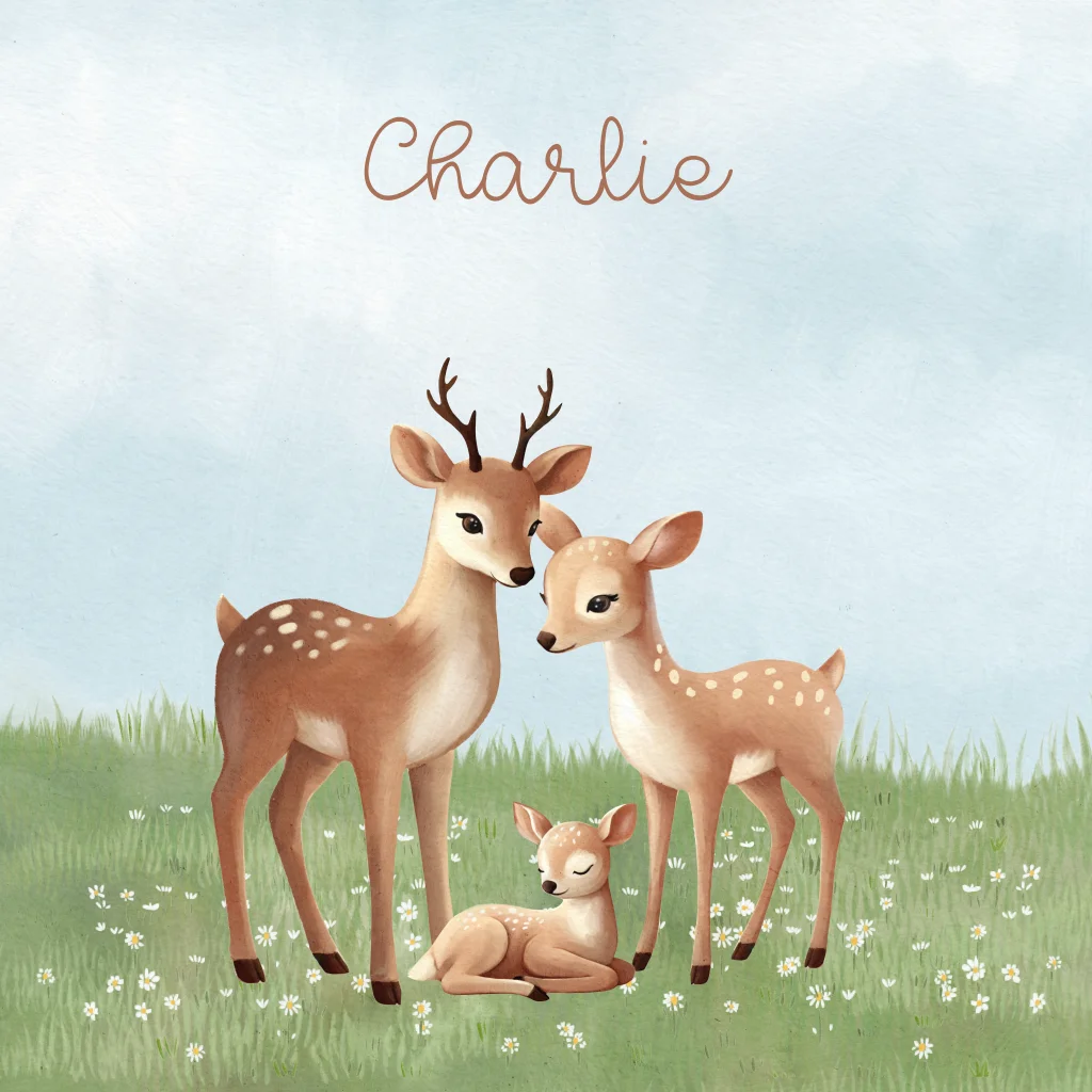 Versier de babykamer met deze mooie poster, passend bij het geboortekaartje. Het hertengezin in het rustige landschap geven de poster een lieve en sfeervolle uitstraling.