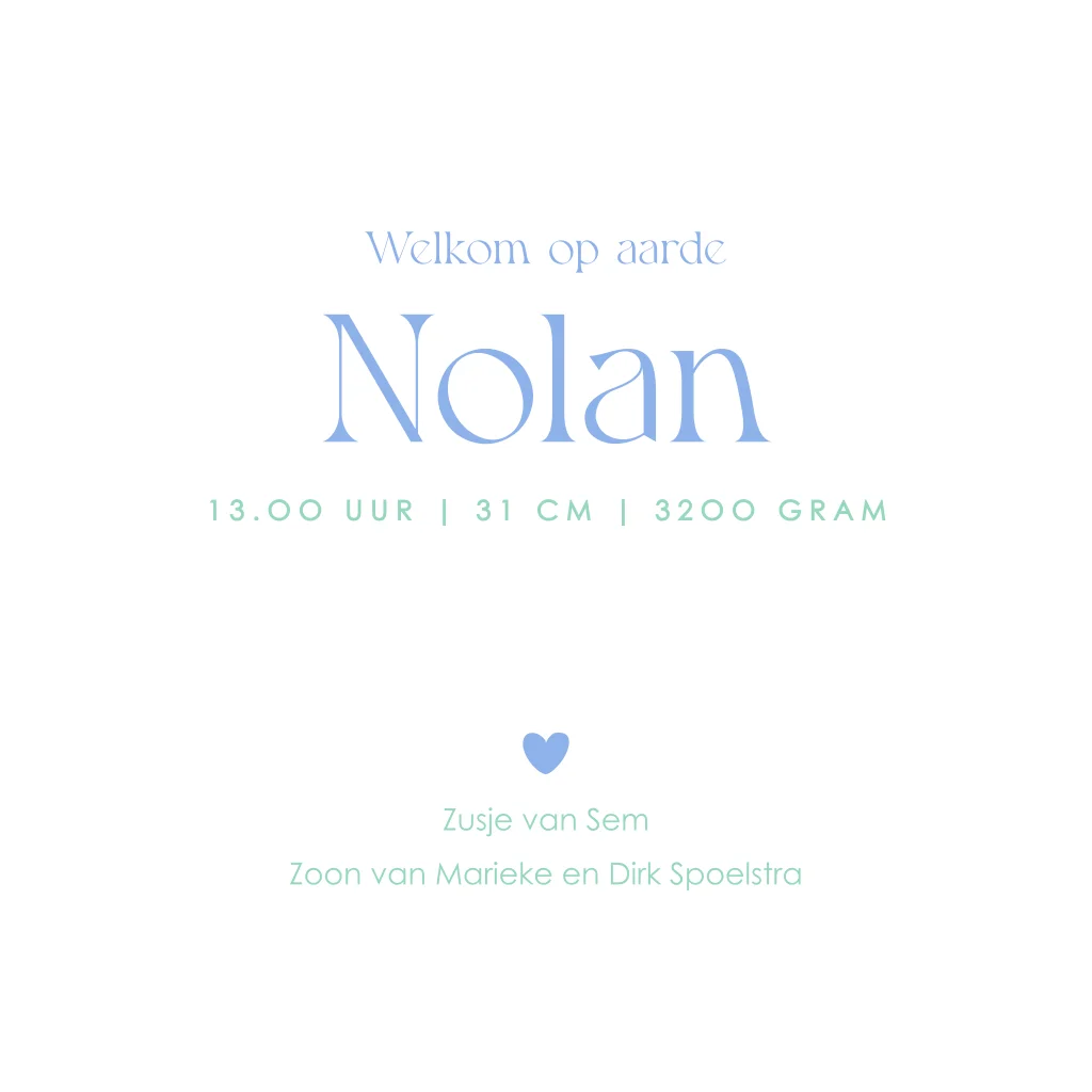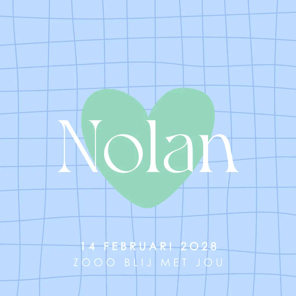 Een hip geboortekaartje voor een jongen. Het kaartje heeft een blauw ruitjespatroon. Het groene hart achter de naam springt er mooi uit. Pas het kaartje naar wens aan in onze online editor.
