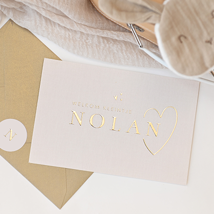 Wat een stijlvol geboortekaartje voor jouw kindje. Het kaartje heeft een beige kleur met goudfolie details. Pas het ontwerp naar wens aan in onze online editor.
