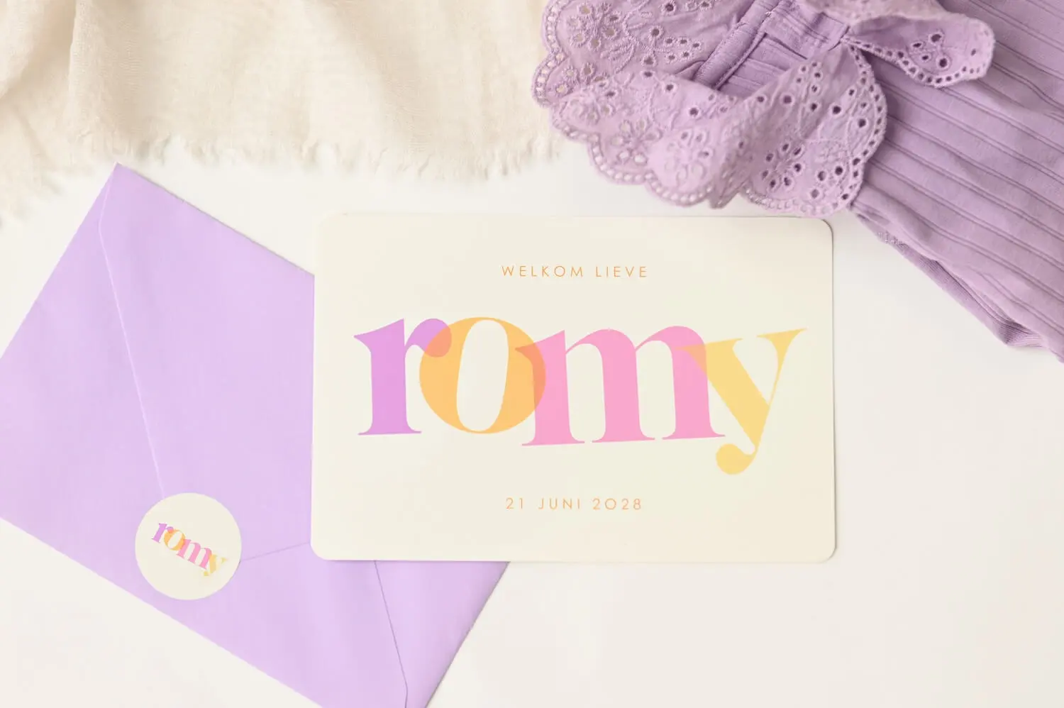 Kondig de geboorte van jullie dochter aan met dit vrolijke kaartje! De naam van jullie kleintje worden gedrukt in kleurrijke letters, zo leuk! Pas het kaartje naar wens aan in onze online editor en bestel snel een proefdruk om dit kaartje in het echt te zien!