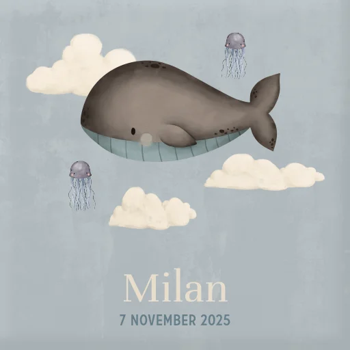 Blauw geboortetegeltje met walvis en wolkjes