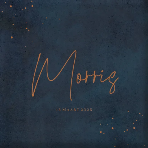 Een stoer geboorte tegeltje. Het tegeltje heeft een donkerblauwe achtergrond met daarop in koperkleur de naam en geboortedatum van het kindje. Bewerk de tegel naar wens.