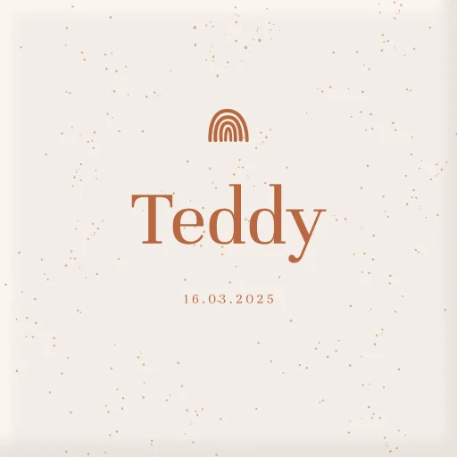 Een vrolijk en speels geboorte tegeltje. De tegel heeft een gestippelde achtergrond met daarop de naam en een regenboogje. Bewerk de geboorte tegel in onze online editor.
