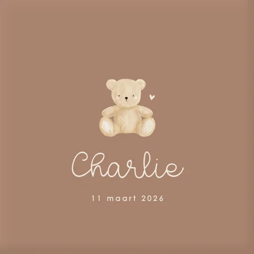 Een lief geboortetegeltje in de stijl van het geboortekaartje. De achtergrond heeft een bruine kleur met daarop een lief teddybeertje. Pas het ontwerp naar wens aan in onze online editor.