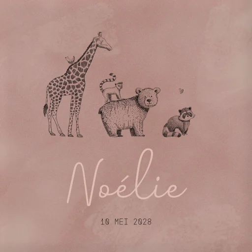 Een vrolijk geboortetegeltje voor jouw kindje. Het tegeltje heeft een oudroze velvet look achtergrond. Op de voorgrond staan pentekeningen van een giraffe, beer, aapje en wasbeer. In het midden lees je de naam en geboortedatum van het kindje. Pas het ontwerp naar wens aan in onze online editor.