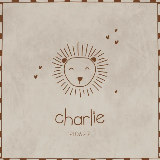 Een stoer geboortetegeltje voor jouw kindje. Het tegeltje heeft een zandkleur velvet look met daarop de lijntekening van een leeuwenhoofd. De kleine hartjes geven het extra lief. In het midden lees je de naam en geboortedatum van het kindje. Pas het ontwerp naar wens aan in onze online editor.