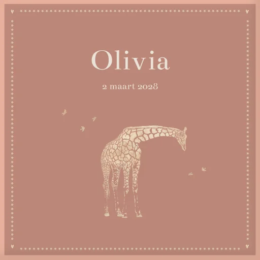 Schattig geboortetegeltje voor jouw kindje. Op het roze tegeltje staat een illustratie van een giraffe. De kleine vogeltjes maken het helemaal af. In het midden lees je de naam en geboortedatum van het kindje. Pas het ontwerp naar wens aan in onze online editor.
