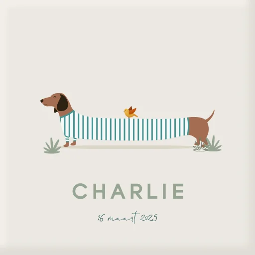 Een vrolijk geboortetegeltje met illustratie van een teckeltje. Onder de teckel lees je de naam van het kindje en de geboortedatum. Pas de tegel naar wens aan in onze online editor.