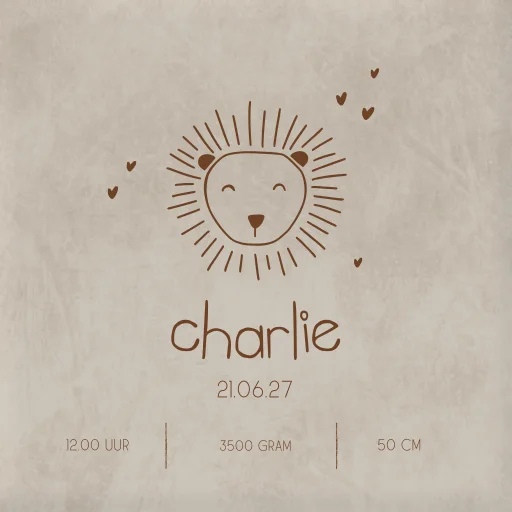 Een stoer geboortetegeltje voor jouw kindje. Het tegeltje heeft een zandkleur velvet look met daarop de lijntekening van een leeuwenhoofd. De kleine hartjes geven het extra lief. In het midden lees je de naam en geboortedatum van het kindje. Pas het ontwerp naar wens aan in onze online editor.