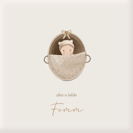 Een lief geboortetegeltje passend bij het geboortekaartje. Op het tegeltje zie je een illustratie van een baby in een beige mandje. Pas het ontwerp naar wens aan in onze online editor.