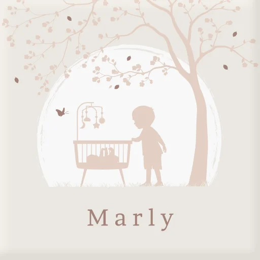 Een stijlvol geboorte tegeltje voor op het kinderkamertje. De tegel heeft een beige achtergrond met daarop een schattige illustratie van een grote broer bij het wiegje van zijn zusje. Pas het ontwerp naar wens aan in onze online editor.