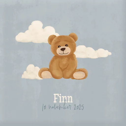 Een hip en lief geboortetegeltje voor jouw kindje. Het tegeltje heeft een blauwe achtergrond met daarop een illustratie van een lieve teddybeer tussen de wolken. In het midden lees je de naam en geboortedatum van jouw kindje. Het ontwerp is naar wens aan te passen in onze online editor.