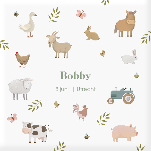 Een vrolijk geboortetegeltje met de geboortegegevens van jouw kindje. Je ziet een witte basis met daarop verschillende boerderijdieren. Pas het tegeltje naar wens aan in onze online editor.