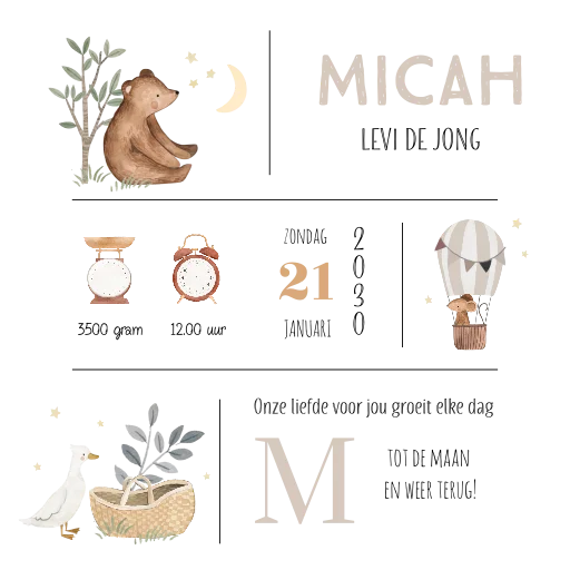Lief tegeltje met geboortegegevens met beren en luchtballon. Pas de gegevens eenvoudig aan in onze online editor.