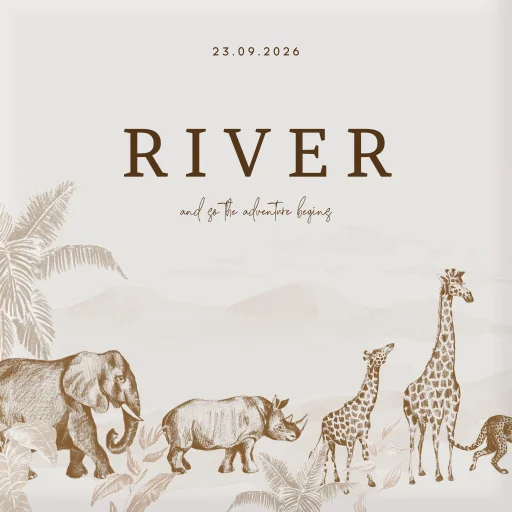 Avontuurlijk geboortetegeltje voor jouw kindje. Het tegeltje is in beige en bruin met op de voorgrond een handgetekend design van jungledieren, superstoer! In een landschap met palmbomen lopen een panter, giraffen, neushoorn en olifant in een optocht voorbij. In het midden lees je de naam en geboortedatum van het kindje. Pas het ontwerp naar wens aan in onze online editor.