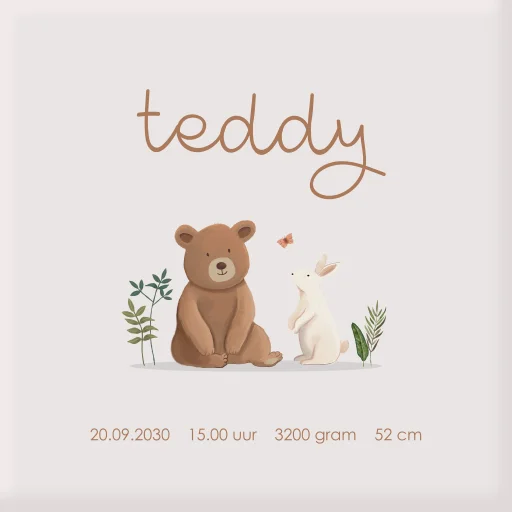Een lieve geboortetegel met vrolijke bosdieren en geboortegegevens. Pas het ontwerp naar wens aan in onze editor.