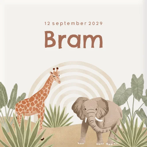 Een hip geboortetegeltje met junglethema. Je leest de naam en geboortedatum van het kindje. Daarnaast zie je een giraffe en olifant door de natuur lopen.