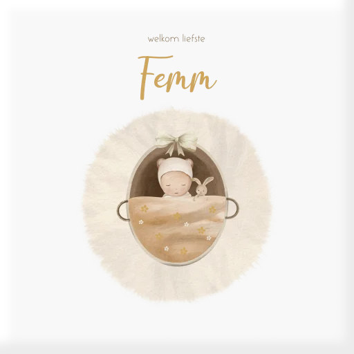 Een lief geboortetegeltje voor een meisje. Het tegeltje heeft een witte achtergrond met daarop een lieve illustratie van een baby in een mandje. Pas het ontwerp naar wens aan in de online editor.