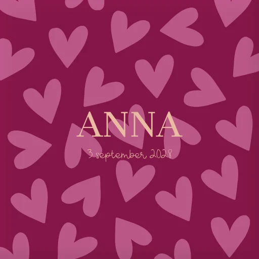 Wat een hip geboortetegeltje! Dit tegeltje heeft een donker paarse achtergrond met daarop lieve roze hartjes. Pas het ontwerp naar wens aan in onze online editor.