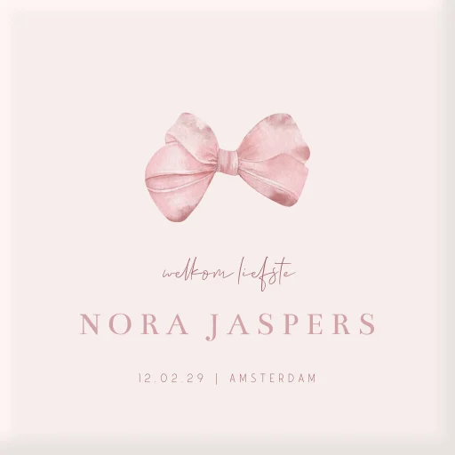Wat een lief geboortetegeltje voor jouw dochter of als cadeau. Het tegeltje heeft een lichtroze achtergrond. Daarop zie je een roze lint met strik. Pas het ontwerp naar wens aan in onze online editor.