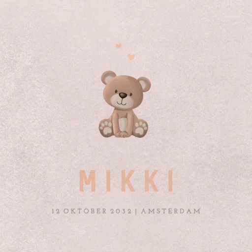 Een schattig geboortetegeltje met een roze achtergrond. Daarnaast zie je een lieve teddybeer met hartjes.